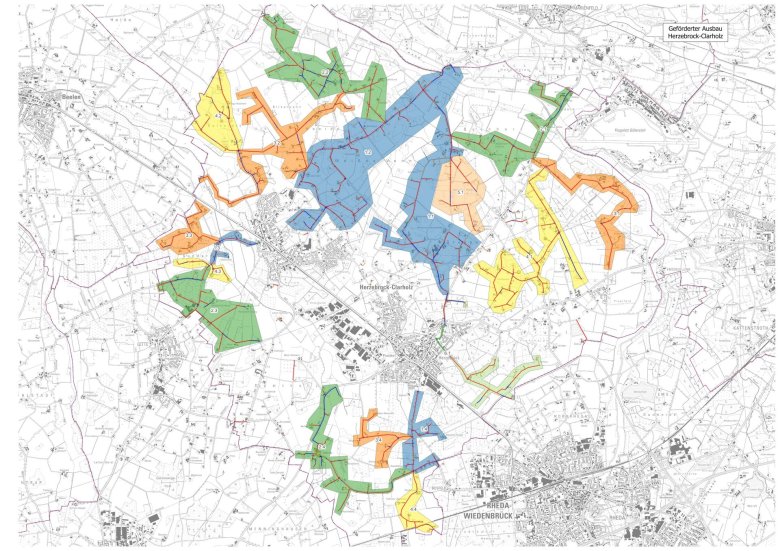 Durch dieses wurde für jede Adresse im Fördergebiet ermittelt, mit welchen Bandbreiten die jeweilige Adresse aktuell und zukünftig versorgt wird. Anhand dieser Daten wurde für jede Adresse die Förderfähigkeit festgestellt. Anschließend hat das beauftragte Beratungsbüro einen Grobnetzplan erstellt und anhand dessen eine erste Kostenschätzung vorgenommen. Diesen Daten wurden dem Rat der Gemeinde Herzebrock-Clarholz Mitte 2020 mit der Maßgabe eine Entscheidung zum geförderten Glasfaserausbau zu treffen, vorgestellt. Dieser hat daraufhin entschieden, dass die Gemeinde den geförderten Glasfaserausbau im Außenbereich durchführen soll und die Verwaltung beauftragt, einen entsprechenden Förderantrag beim Bund und beim Land zu stellen. Gleichzeitig wurde festgelegt, dass der Ausbau im sogenannten Betreibermodell erfolgen soll, bei dem das Glasfasernetz durch die Kommune gebaut und für den Betrieb an ein Telekommunikationsunternehmen verpachtet wird.